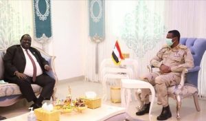 إلتقى الفريق أول محمد حمدان دقلو النائب الاول لرئيس مجلس السيادة الإنتقالي رئيس الوفد الحكومي لمفاوضات السلام بين الحكومة والجبهة الثورية بمكتبه اليوم رئيس الوساطة الجنوبية المستشار توت قلواك.