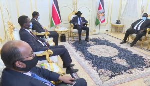 إستقبل الفريق أول سلفاكير ميارديت رئيس دولة جنوب السودان بأمانة حكومة الجنوب بجوبا النائب الأول لرئيس مجلس السيادة الانتقالي رئيس الوفد الحكومي لمفاوضات السلام الفريق أول محمد حمدان دقلو بحضور الفريق أول ركن شمس الدين كباشي عضو مجلس السيادة الانتقالي ورئيس لجنة الوساطة الجنوبية المستشار توت قلواك مستشار الرئيس سلفاكير للشؤون الأمنية.