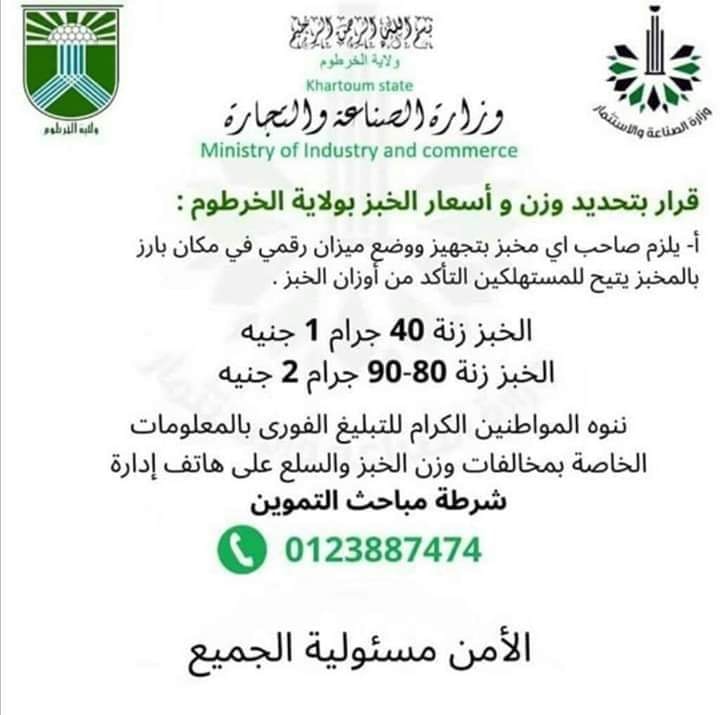 مناشدة للمواطنين بولاية الخرطوم بالتبليغ عن مخالفات أوزان الخبز والسلع 0 9 Facebook Twitter Pinterest WhatsApp مناشدة للمواطنين بولاية الخرطوم بالتبليغ عن مخالفات أوزان الخبز والسلع